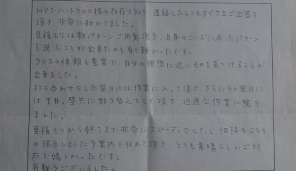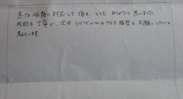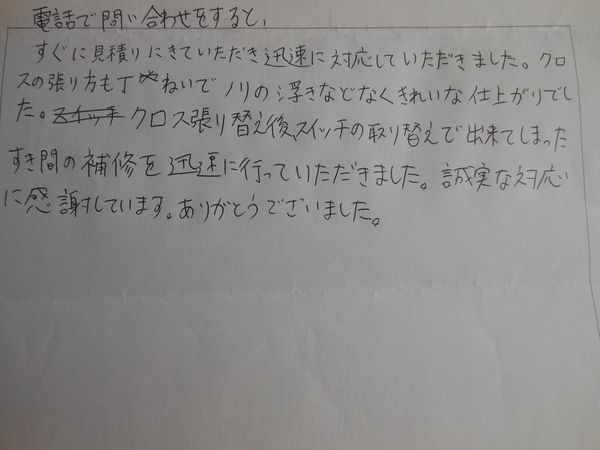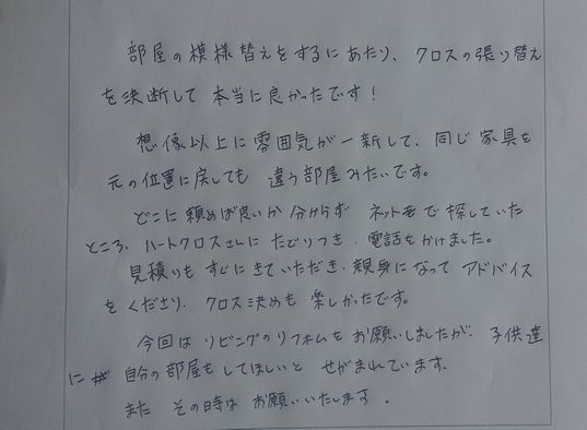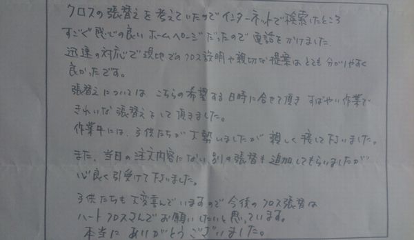 こちらのページではクロス貼り替えなどの内装リフォームをさせていただいたお客様の声をご紹介しています。貴重なお時間を使って書いていただきありがとうございます。