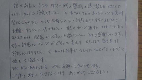 娘が成長し子供っぽさの残る壁紙の貼替えをすることになりネットで検索しました。ハートクロスさんのホームページを見つけ電話をかけるととても気持ちのいい対応をして下さいましたのでお願いすることに決めました。