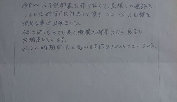 今月中に子供部屋を作りたくて見積りの電話をしましたが、すぐに対応して頂き、スムーズに日程を決める事ができました。仕上がりもとても良く、綺麗な部屋になり息子も大満足しています。忙しい時期だったと思いますが、ありがとうございました。