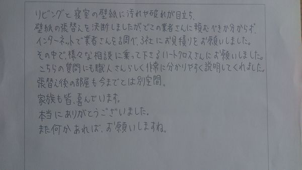 子どもたちも大変喜んでいますので今後のクロス張替えはハートクロスさんでお願いしたいと思っています。本当にありがとうございました。