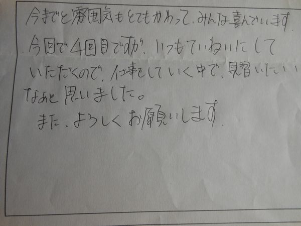 今までと雰囲気もとてもかわって、みんな喜んでいます。今回で4回目ですがいつもていねいにしていただくので仕事をしていく中で見習いたいなあと思いました。